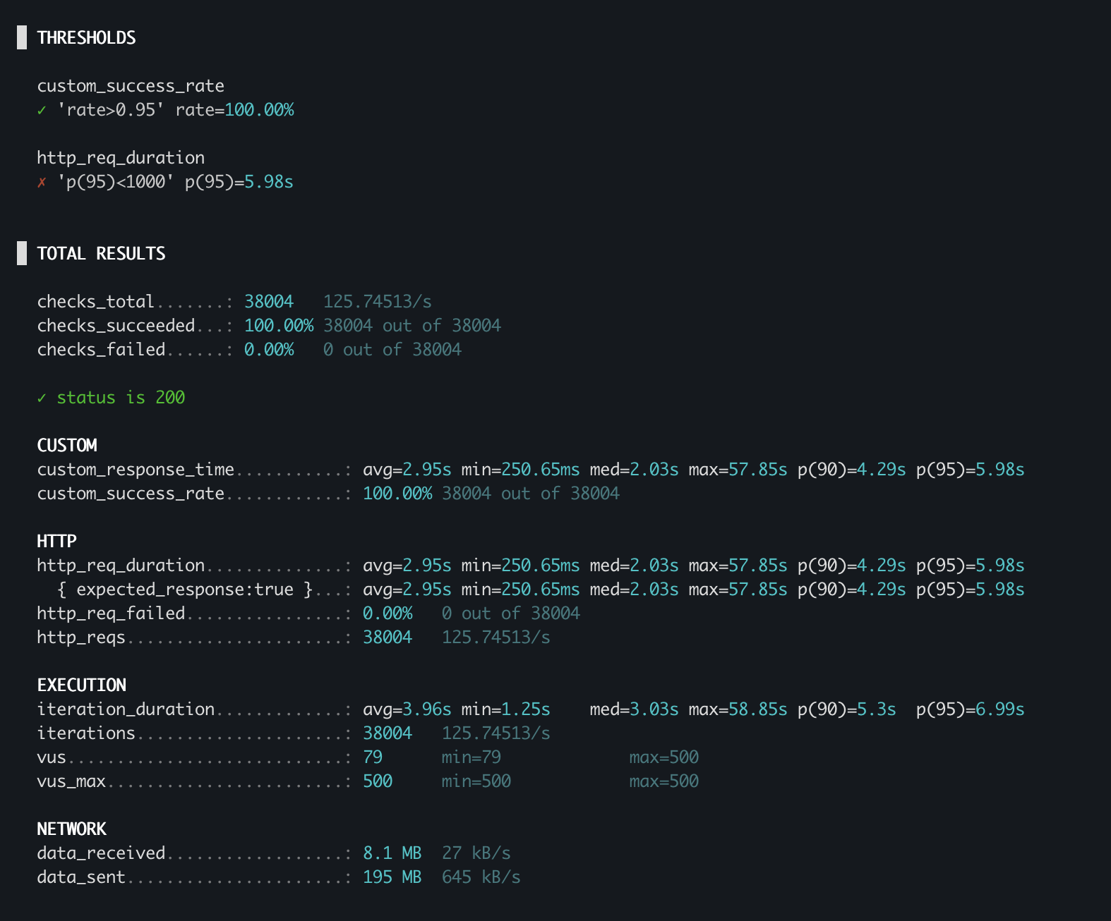 At 500 virtual users (VUs), we achieved a 100% success rate with 38,004 deals successfully created.