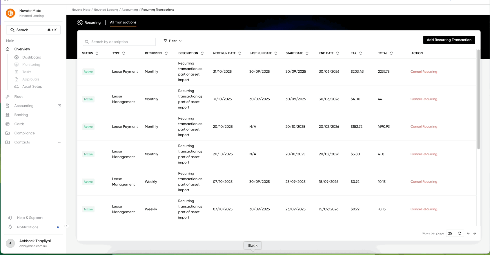 The recurring transaction details page now includes a Transactions view that lists every occurrence tied to the recurring setup. Open any transaction to see its full details — status, amounts, receipts, and associated asset.
